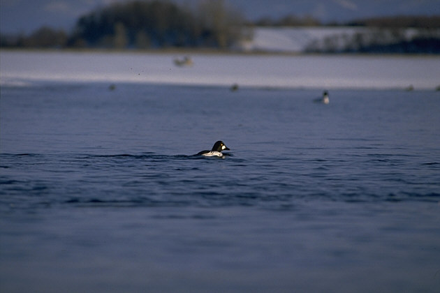 L45p オスの頭部は独特の三角形に近い形をしている。緑色の金属光沢のある黒色で嘴基部近くに白い丸い斑がある。背、腰、上下尾筒、尾は黒く、肩羽は白い。下面はほとんど白色。飛んだ時、雨覆の白と風切の黒とのコントラストが明瞭になる。冬季に多数渡来する。比較的波の静かな海上、港内などでよく見られる。 |