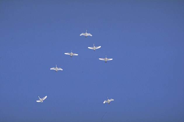 L140p 全身白色。嘴と足は黒色。上嘴の基部は黄色。嘴の黄色の部分のパターンは個体差が大きく個体識別の手がかりに使われる。若鳥は灰色で上嘴基部の色は淡紅色。給餌場などでは家族単位で行動し、家族間の優劣関係を観察することができる。 風蓮湖は全国的にみても有数の休息場所で春と秋には多数の群が滞在する。また、春別川河口部の白鳥台では越冬する個体も多い。標津町では上空を通過する群が数多く見られ、春と秋の風物詩となっている。 |