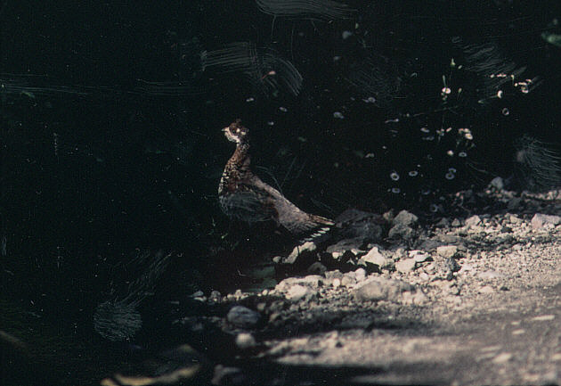 L36p オスの頭上、後頭、目の下、顎側ははい黒色で黒い横斑があり、後頭の羽毛は少し長い。後頚、背、腰は灰褐色で黒い細かい横斑がある。尾は灰褐色で中央の2枚には黒い横斑があり、残りの尾羽の先端が白く、その内側はは黒帯となる。肩羽は黒褐色で外側が白い。つばさは褐色で黒褐色の斑がある。喉は黒く、くびとの境に白線がある。胸から腹は白地に黒い縁取りのある三日月斑がならんでいる。メスはオスににているが上面は少し褐色みが強く、喉は黒褐色と白のまだら。雌雄共に目の上の肉冠が赤くて、足には白い羽毛が生えている。 留鳥で日本では北海道のみに生息している。他に、サハリン、沿海州、中国東北部に生息。極東シベリアの代表的な野鳥で、「デルス・ウザーラ」の物語やバイコフの随筆などによく登場する。最近個体数が減少しているといわれ、1988年秋に根北峠で確認された記録がある。その他に1996年9月、ポー川史跡自然公園の復元住居付近で観察されている。 |