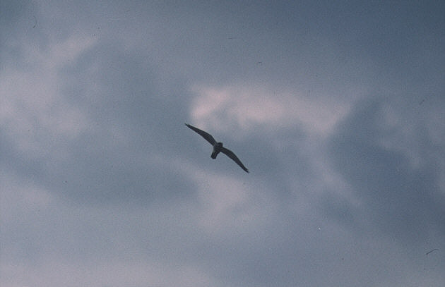 Lオス38p メス51p 頭上から後ろ頚にかけては石板灰色。背、翼、尾は暗青灰色で、尾は比較的短く黒帯がある。頬にはひげ状(もみあげ状)の黒斑が目立つ。下面は白く腹は黄褐色を帯び、黒色横斑が密にある。翼下面には白地に黒色がある。飛んでいる鳥に対して上から急降下して足で蹴って捕らえる。速くて浅いはばたきと短い滑翔を交互にして速く飛ぶが、上昇気流にのって輪を描くこともある。秋から春にかけて尾岱沼、茶志骨川河口の湿原などでしばしば見られる。 |