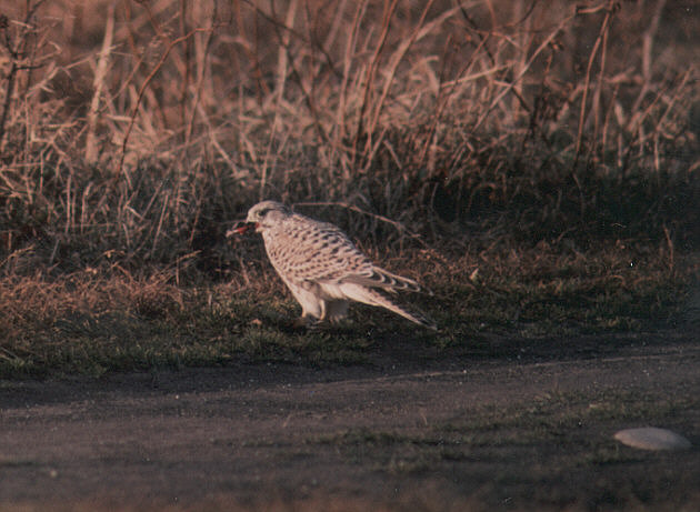 Lオス30p メス33p 尾が長く見える。翼の先はあまり尖っていない。オスは頭上から顔が青灰色、背と雨覆が茶褐色で黒い斑点があり、風切は黒く、尾は青灰色で先が黒い。下面は淡黄褐色で胸から腹には黒い縦線がある。メスは上面が褐色で黒い斑点があり、尾には数本の黒帯がある。下面は淡黄褐色で黒い縦斑がある。翼の下面は雌雄とも白地に黒斑があるが、オスの方が斑が少なくて白っぽく見える。ひらひらしたはばたきと短い滑翔を交互に繰り返して直線的に飛ぶ。ひんぱんに停空飛翔をする。尾岱沼や標津川沿いの原野などで観察できる。 |