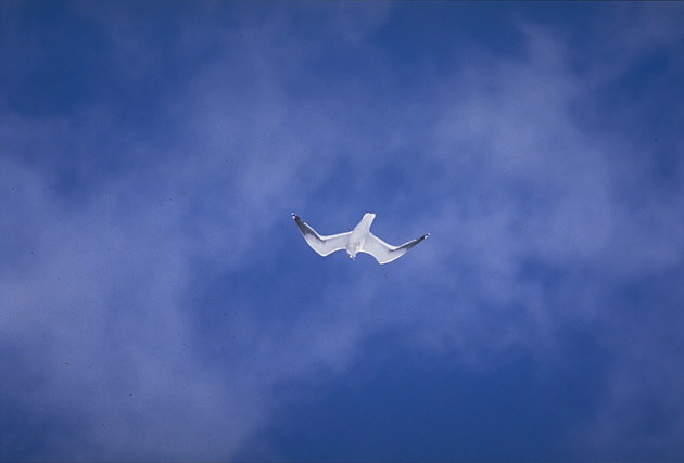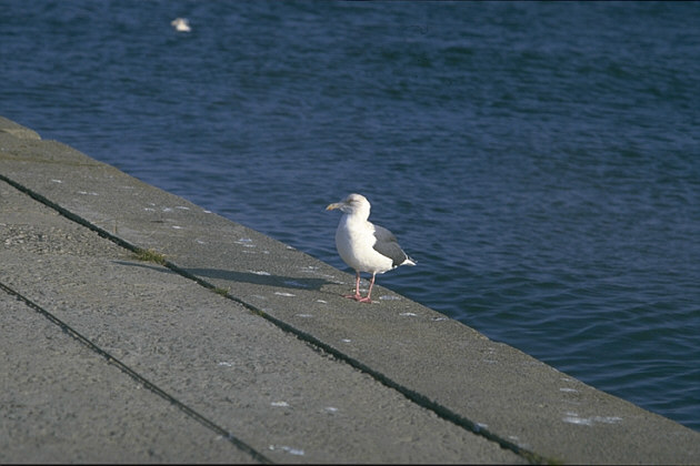 L61p 翼の上面と背は石板灰色で翼の先端は黒くて白斑がある。翼の前縁および後縁は白い。体の多の部分は白色。嘴は黄色く下嘴の先端近くに赤い点がある。足は淡紅色。知床半島の崖のあちこちで繁殖している。羅臼町では倉庫の屋根の上などで営巣した記録もある。 標津町での繁殖例はないが、一年中普通に見られる。 |