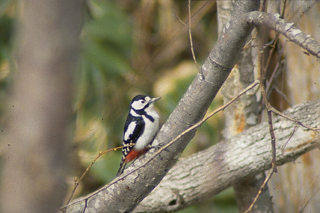 L23.5p 一年中生息する留鳥。もっとも普通のキツツキである。黒色を基調とした羽に白いまだら模様があり、背面に逆八の字形の大きな白色の斑紋がある。頭頂部と下腹部が赤い。「まだらの着物に赤い腰巻き」などと形容される。現代風に言えば「チェックのシャツに赤パンツ」となるかもしれない。 |