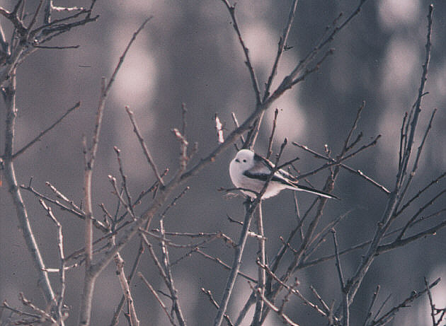L13.5p どこにでも普通にいる留鳥。綿帽子を被ったような純白の頭部と細く長い尾羽が特徴的で飛んでいても他種と見誤ることはない。ジュリジュリジュリと濁った声で鳴く。蜘蛛の糸を利用してとっくり形の巣を作る。 北海道のエナガには本州のエナガにあるような眉線が無く、シマエナガと呼ばれて別亜種になっている。 |