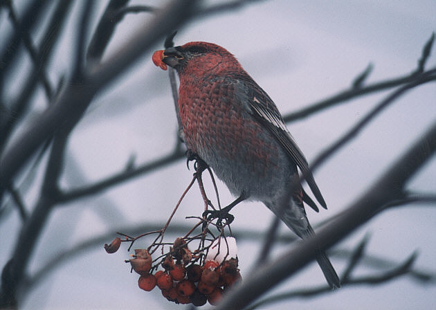 L20p 知床、大雪山などのハイマツ帯で一部が繁殖しているが、冬季には冬鳥として飛来する。1987年1月18日野付半島基部でハマナスの実を食べている小群が確認さている。 |