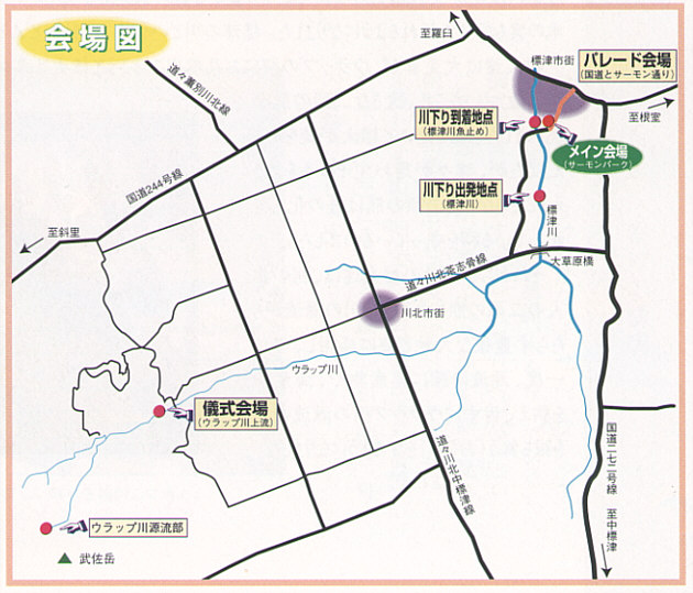【祭りの構成】 祭りは2日の日程で開催され、3部で構成されています。 第1部は、「ウラップ伝説」に基づき水に感謝し、水を守っていく「格式の儀式」と「前夜祭」が行われます。 第2部は町民などによる芸能・文化の披露や産業繁栄の喜びの場として、各種催しや飲食の提供が行われる「産業と食・遊び文化の伝承祭」、 第3部は、町民総参加をうたい文句に、シンボルの水を振る舞い、その喜びと繁栄の誓いを表した「曳山巡行」。5基の山車と伴に曳き手、踊り手、お囃子手が一体となって町内を練り歩き、祭りは最大の盛り上りを見せます。 日 程 平成12年8月5日(土)・6日(日) 内 容 第1部(5日)儀式・前夜祭 第2部(6日)産業と食・遊び文化の伝承祭 第3部(6日)曳山巡航(踊り、山車のパレード) 会 場 (地図参照) 儀式会場 ウラップ川源流・標津川 メイン会場 標津サーモンパーク 曳山巡航 国道244号・サーモン通り・サーモンパーク ![]() 飛び入りで踊りたい人大歓迎です。町内、町外・年齢・性別を問いません。 祭り会場、曳山巡行沿道は町民参加による提灯(1100灯)でいろどられます。 (問合せは標津町民祭り・水・キラリ実行委員会 総括事務局標津町役場商工観光課 (01538−2−2131) キラリ音頭 |