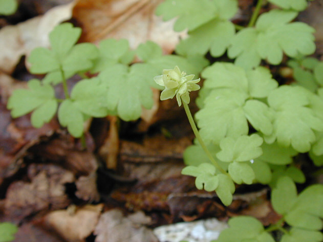 | レンプクソウの花です。目立ちませんがよく見るとおもしろい花の付き方をしています。茎の先に5つの花を付けますが、ちょうど立方体(6面体)のそれぞれの面に花を付けたような形をしています。花が5つなのは茎がついている部分には花がないからです。 ポー川史跡自然公園 |