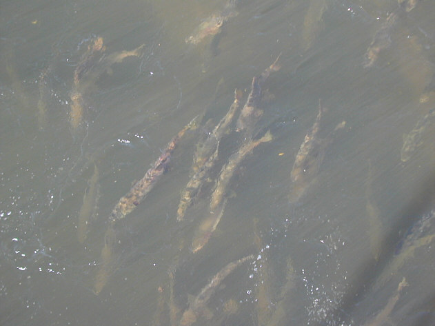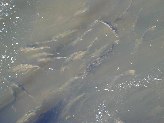 ![]() 管理橋の上から見下ろしたカラフトマスの様子。まだ数は少しですが、シロザケも混ざっていました。 ここから魚道をつたい、サーモン科学館内の魚道水槽にも魚が遡上しています。