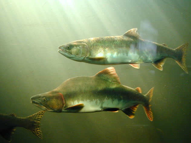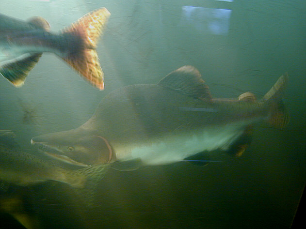 | 魚道水槽で、美しいカラフトマスを間近に観察できます。