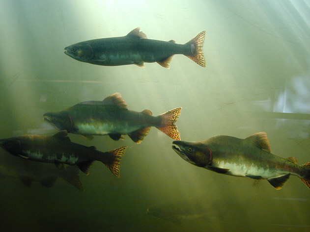 | 魚道水槽でカラフトマスがたくさん見られます。 |