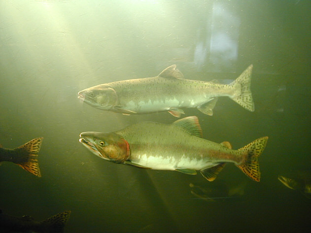 ![]() カラフトマス。尾ビレが色づき、美しい。尾ビレの黒い斑点が目立つ。腹は白い。 ![]() カラフトマスのオス(下)とメス。 背中は緑色で黒い斑点模様があります。中にはヒョウ柄のもいます。 エラブタのピンクの縁取りもきれいで、まるで産卵に向けておしゃれをしているようです。 |