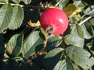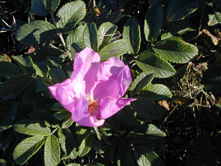 | ハマナスは赤い大きな実をたくさんつけています。少しですが、まだ花も咲いていました。 野付半島にて。 |