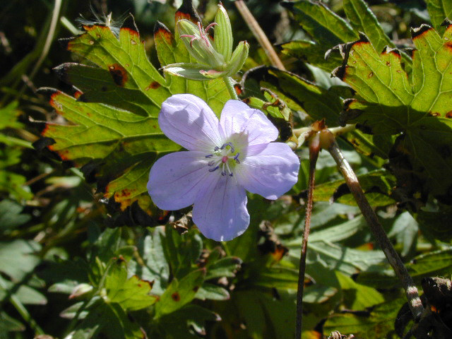 | よく似ている、エゾフウロとハマフウロの花。見分けるのには、がく片に生えている毛の様子を見るのが分かりやすいでしょう。ハマフウロのがく片はほとんど長い毛は見られません。エゾフウロのがくには、長い白い毛がたくさん生えています。また、ハマフウロでは、エゾフウロよりも葉の切れ込みが浅いです。 野付半島にて。 |