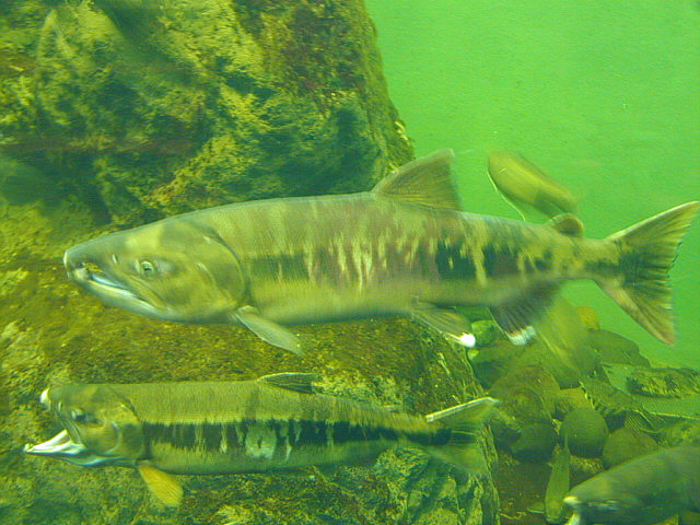 | サーモン科学館の大水槽(海水)のシロザケ。 上がオス、下がメスです。海水中では産卵はしません。 |