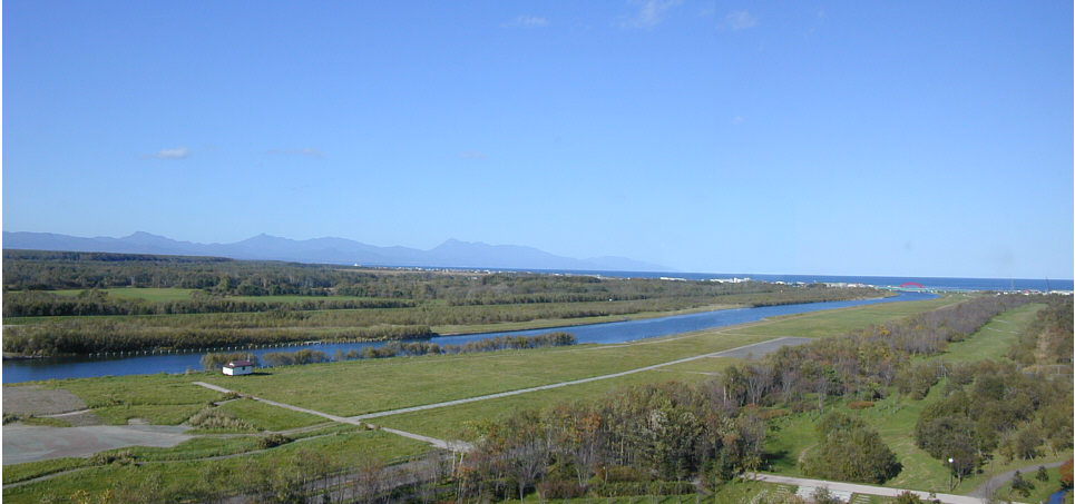 | サーモン科学館の展望塔からの風景。パノラマで一帯を見渡せます。 知床連山などの山並みがよく見えました。 |