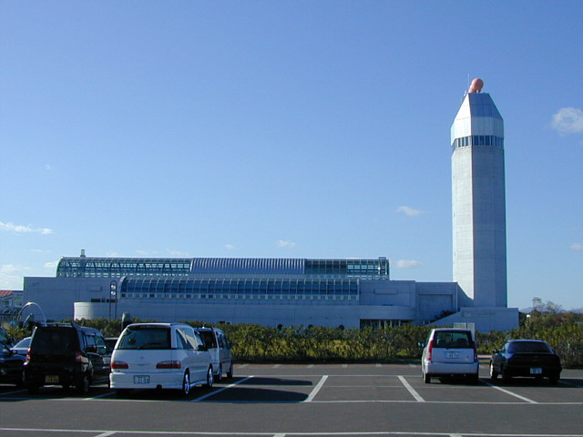 | サーモン科学館の外観。 展望塔の上にはサケの卵、イクラをイメージした球が3つ乗っています。 |