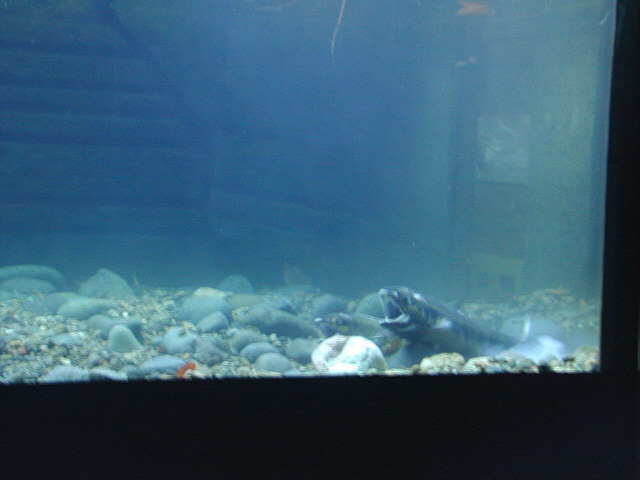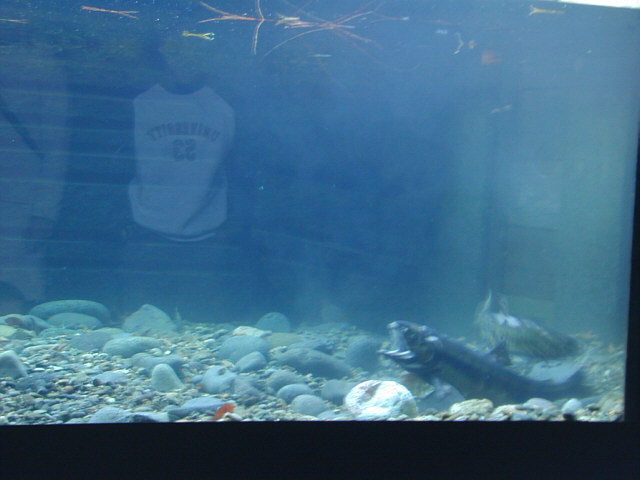 | 標津サーモン科学館では、現在魚道水槽でシロザケの産卵行動を展示しています。 メスが産卵場所を決め、卵を産みこむために底の砂利を掘り、オスはそれに付き添います。このような産卵にともなう興味深い行動を直接観察できます。運が良ければ産卵の瞬間にも立ち会えるでしょう。 |