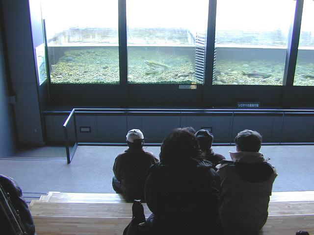 | 標津サーモン科学館では、現在魚道水槽でシロザケの産卵行動を展示しています。1日に1-3回ほど産卵させるようです。見学に来た人たちは、学芸員の説明に耳を傾けながら、熱心に観察していました。 産卵行動の展示は11月30日まで。12月からはサーモン科学館は休館となります。開館は翌年2月です。 |