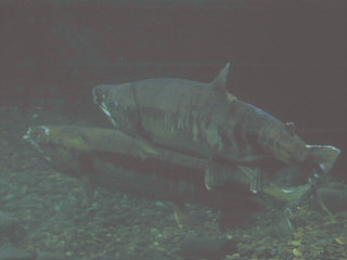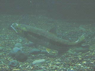 ![]() シロザケの産卵行動を見学。学芸員の小宮山さんが説明をしています。 ![]() オス1匹、メス1匹のペアが水槽の一部屋に入れられています。計 2組のペアが観察できます。