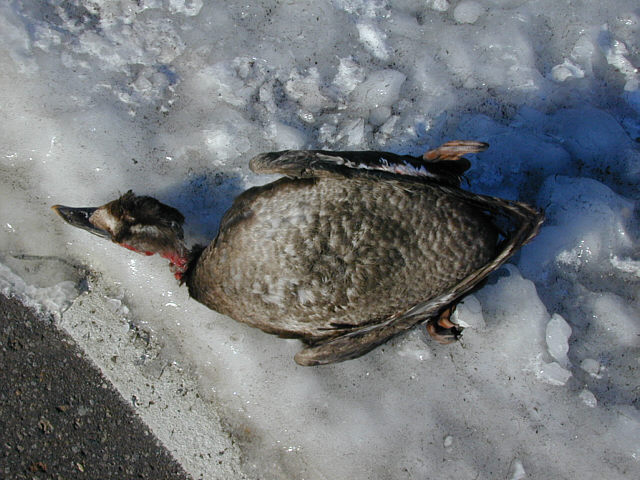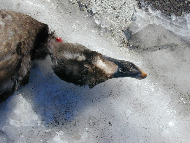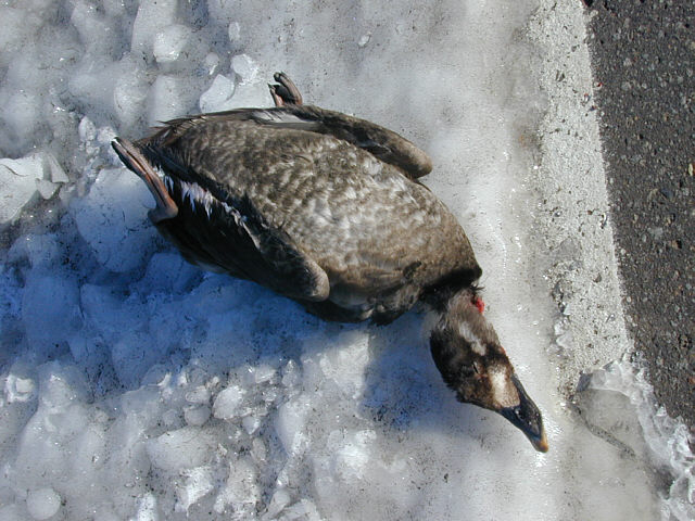 | 野付の道路脇にビロードキンクロのメス(若鳥?)死体。 ほほと目の後ろの白い斑点が特徴です。 ビロードキンクロは数は多くありませんが、冬、このあたりの海岸にいます。 |