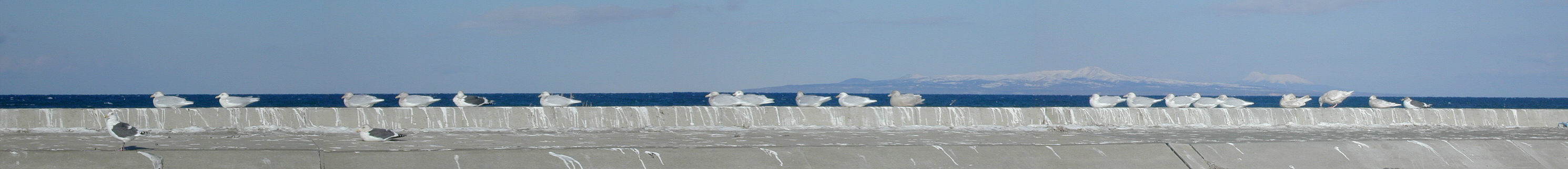 | 普段一番多いオオセグロカモメよりも、今日の野付ではシロカモメがたくさんいました。 野付ではオオセグロカモメよりシロカモメの方が多く、風を避けて氷上や防波堤にじっとしている姿が見られました。 多くはシロカモメの成鳥ですが、中に若鳥が混じっています。シロカモメの若鳥は全身真っ白に近い色をしています。 シロカモメは全体に白っぽく、特に翼の先が白いのが特徴です。オオセグロカモメ(写真手前)は背中が黒っぽく、翼の先も黒くなっています。 後ろは国後島(左:泊山、右羅臼山) |