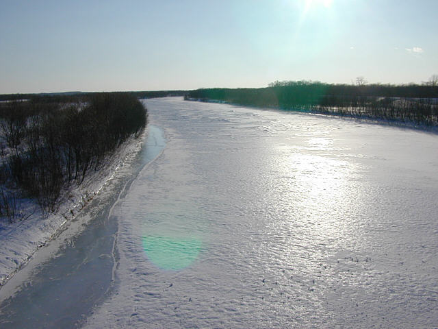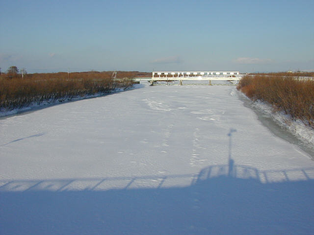 | 標津川の河口付近、サーモンパークの横。川の表面はほぼ全面凍っています。 川が全て凍ってるわけではなく、氷の下では水が流れています。 |