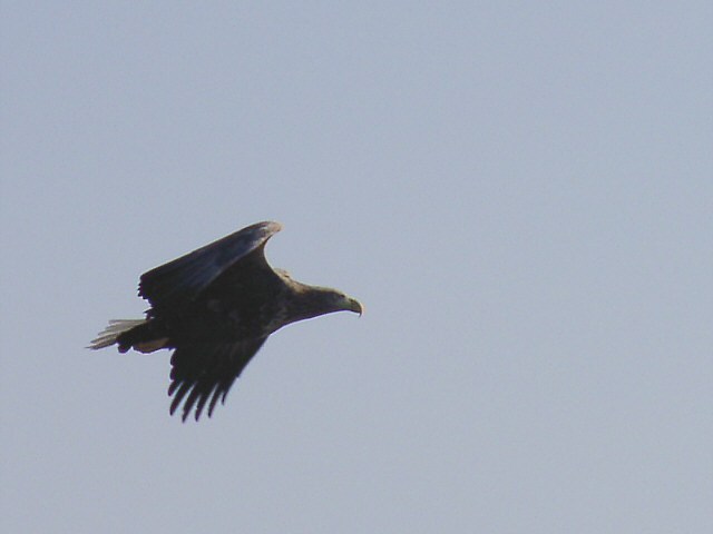 | オジロワシは、翼を広げた長さが180-230pになるワシです。大部分が冬鳥として渡来しますが、北海道の東部および北部で繁殖するものもわずかにいます。主に魚を食べます。成鳥は全体が褐色で、頭から首にかけては白っぽく見えます。尾はくさび形ですが、オオワシよりも短く見えます。 |