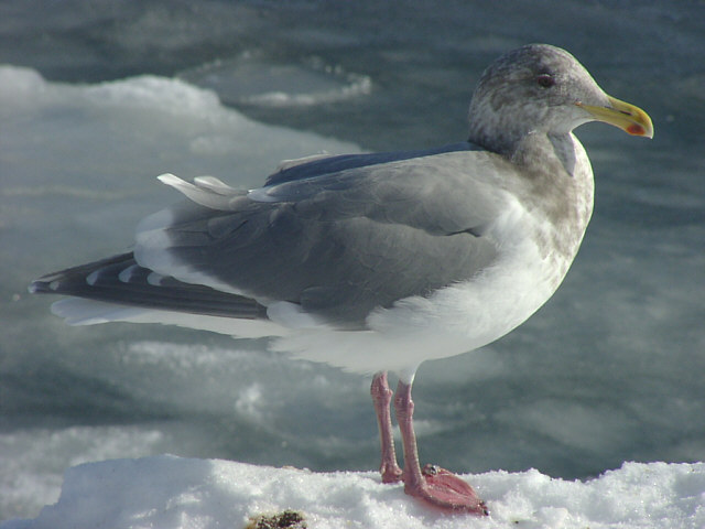 | ワシカモメの成鳥。ワシカモメは、冬の北海道では普通に見られますが、本州中部以南ではまれにしか見られません。本種だけの群にはあまりならず、他のカモメ類の群れに混ざって見られます。全長64p。名前のように、日本で見られるカモメ類の中で、くちばしが一番大きくごつく見えると言います。 背中の灰色は、いっしょに見られるオオセグロカモメよりも、ずっと明るい色です。 シロカモメも背中が薄い灰色ですが、翼の先端が真っ白なので、ワシカモメと見分けられます。ワシカモメの翼の先端は、背中の色と同じ様な灰色です。オオセグロカモメでは、翼の先端が黒いです。 近くで見ることができたら、目の色も観察してみてください。オオセグロカモメ、シロカモメの成鳥は、虹彩が黄色ですが、ワシカモメの虹彩は褐色を帯びているため、目が黒く見えます。 |