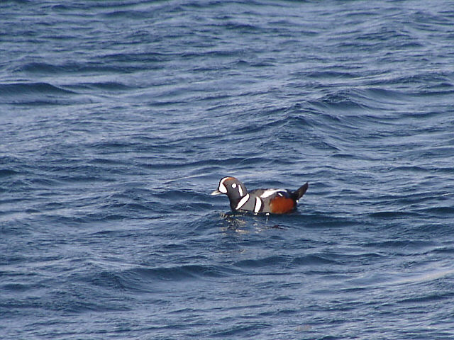 | シノリガモは、体が丸い小型の海ガモです。海ガモと呼ばれるカモの仲間は、潜水が得意です。全長43p。 オスは変わった模様をしています。英語では、Harlequin Duck (ピエロガモ)。和名のシノリガモは、オスの白い模様が、しのりと読める事からついたという説があります。どちらも変わった模様からきた名前です。 メスは、全体に黒っぽい褐色で、顔の白斑が目立ちます。 主に冬鳥として渡来しますが、東北地方以北では少数繁殖しています。子育ては山間の渓流で行います。 |