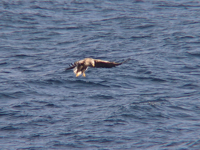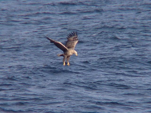 | オジロワシの成鳥が海岸に沿って不意にあらわれ、海中の何か(潜水したカモ?)が浮上するのを待つように