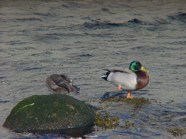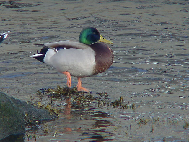 ![]() マガモのオス(右)。岩の上で休んでいるのはシノリガモのメス。 ![]() 頭の緑色が光に輝きます。足は赤みの強いオレンジ色。胸の紫がかる焦茶色も美しい色合いです。 オスは、お尻のカールした黒い羽が可愛らしいです。アヒルのオスにも、このカールした羽があります。 |