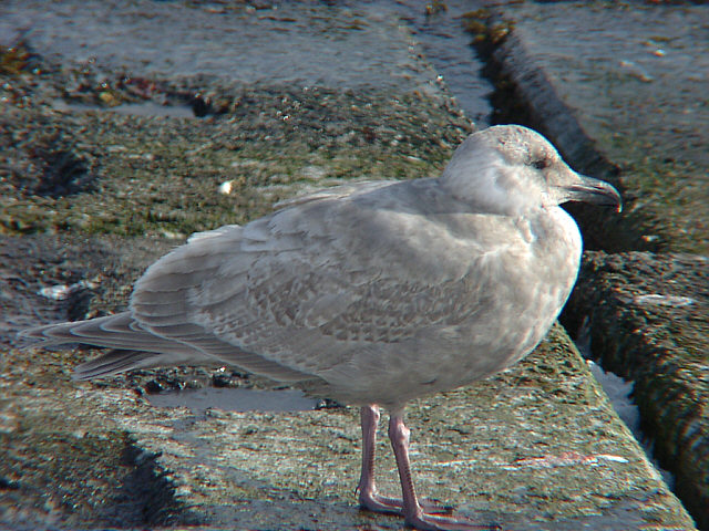 ![]() ワシカモメは、ごついくちばしをしています。 ![]() 手前がワシカモメの若鳥、背と翼の先端は同じ色合い(淡いグレー)。 後ろはオオセグロカモメの第2回冬羽と思われる個体。オオセグロカモメは翼の先が黒い。 大きさ:オオセグロカモメ(全長61p)<ワシカモメ(全長64p)<シロカモメ(全長71p) |