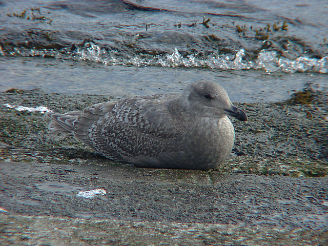| ワシカモメの若鳥。全体が灰色なのが特徴。背と翼の先端は同じ色合い。くちばしは黒い。