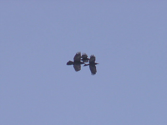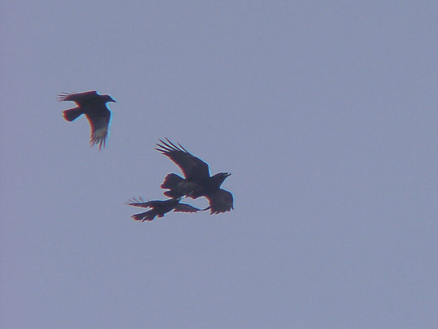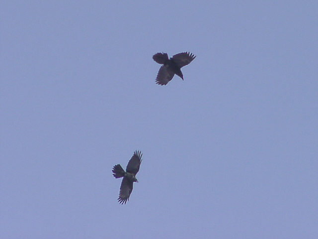 ![]() 空中サーフィンを楽しむ、ワタリガラス達。 風に上手に乗ります。 ![]() ハシボソガラスとワタリガラスの競争。ワタリガラスは体が大きい。 |