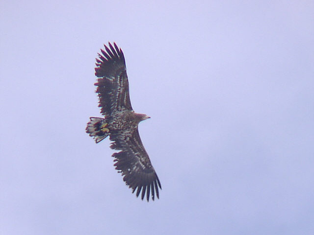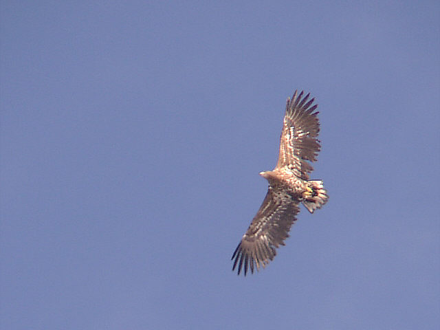 | オジロワシの若鳥。トレードマークの尾は、まだ白くなっていません。体や翼に白い羽がまじり、斑模様になっています。 やはり、成鳥の方が美しい。 |