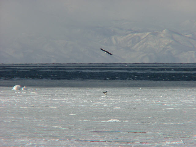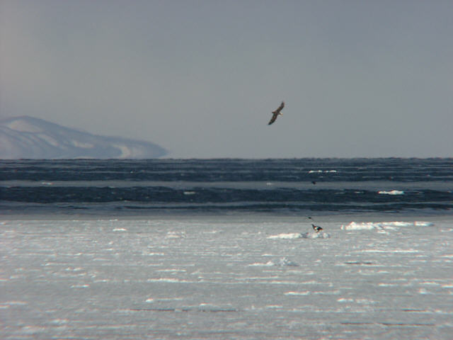 | 氷の上にカモの死体があってそこにオジロワシやオオワシがやってきています。 知床半島が浮かび上がって見える幻氷(蜃気楼)が見えました。 野付半島にて。 |