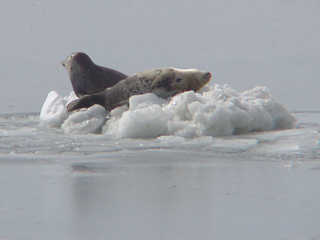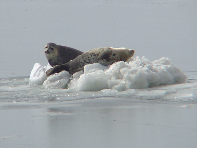 | 昼寝をするゴマフアザラシ。1頭は熟睡していますが(死んだように眠っていました)、もう1頭はなかなか寝付かれないようでした。 |