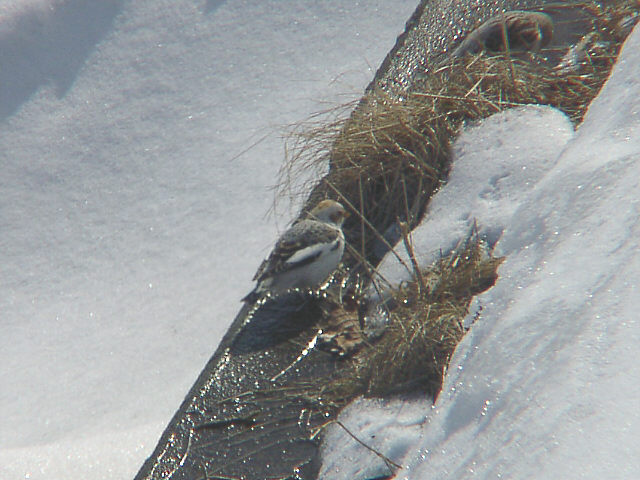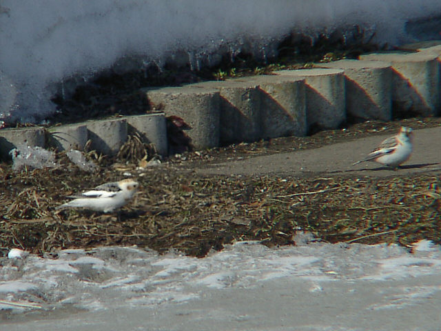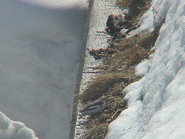 | ユキホオジロのつがいがいました。冬鳥として主に北海道に渡来します。渡来数は年によって多少があります。地上を歩きまわり、植物の種子を食べます。名前の通り、白い体をしているので、他の小鳥との見分けはしやすいでしょう。翼が長く、飛行速度は速いです。 全長16pで、スズメより少し大きい。 飛びながら、「クリリリリ・・」とちょっとカワラヒワに似たような声で鳴いていました。 |