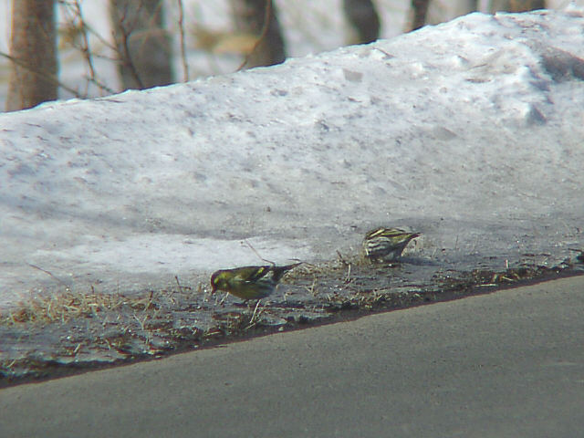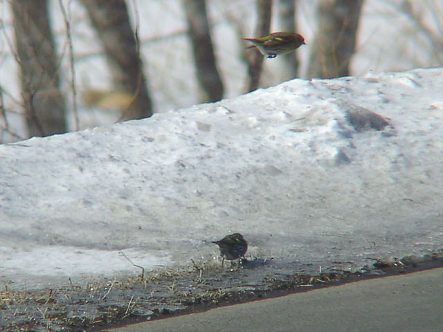 | マヒワがいました。全長12.5pでスズメよりも小さな小鳥です。オスは顔から腹にかけて黄色く、翼にも黄色い線が入っています。背中は黄緑色です。メスはオスよりも淡い色あいです。 道路わきで草の種子を探していました。群でハンノキの実を食べているのを良くみかけます。 |