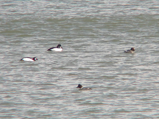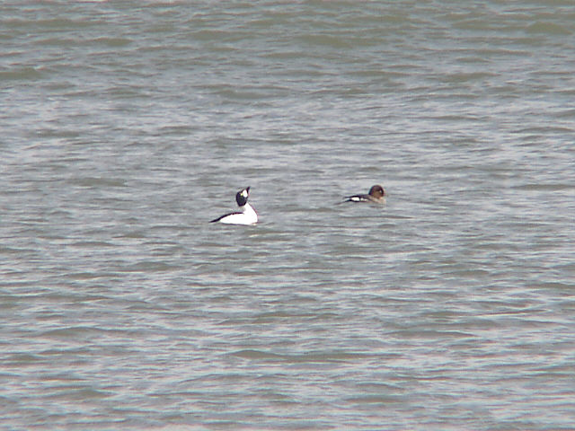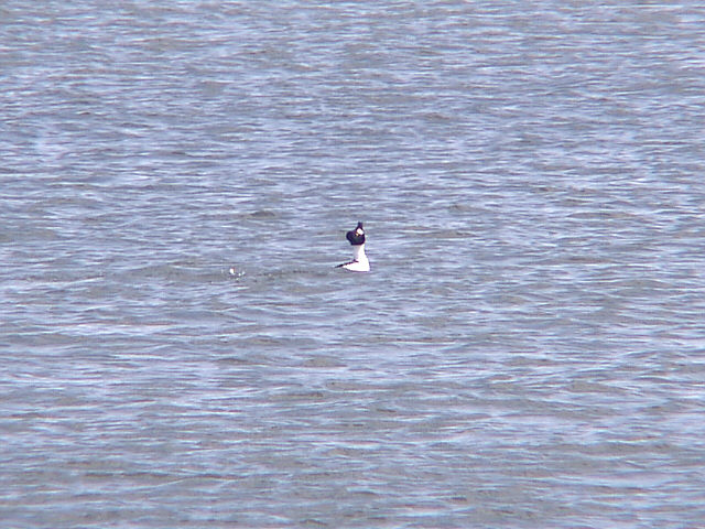 | ホオジロガモのディスプレイ(通称ウペ)。 首を伸ばしてくちばしをつきだした後、写真のように思い切り後ろに反り返る。 その時、「ウペー」というような声を出す。今日はこの他にコオリガモの「アアオナ」と聞こえる声もよく耳にしました。 |