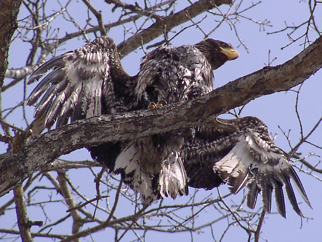 | オオワシの若鳥。餌をとるのに失敗して海に落ちたのでしょう。びしょぬれの翼を乾かしていました。 |