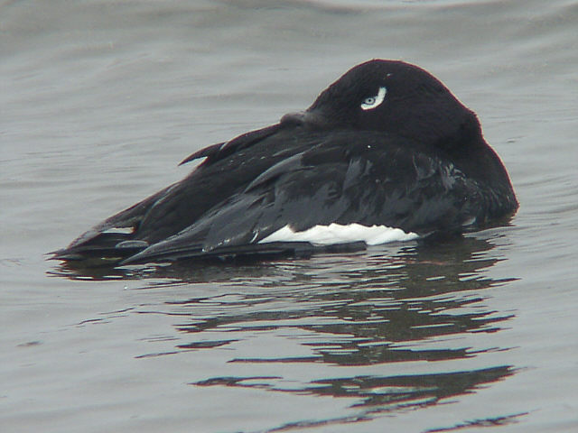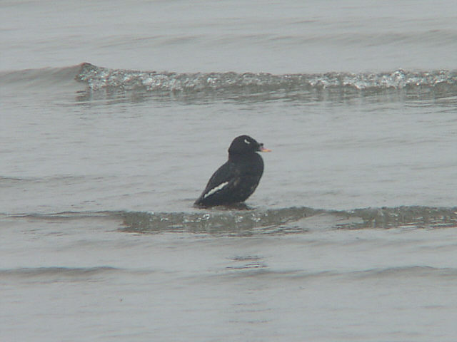 | ビロードキンクロのオス。大型の海ガモで、普通は沖にいます。弱っていて岸辺近くで休んでいた様子です。 |