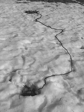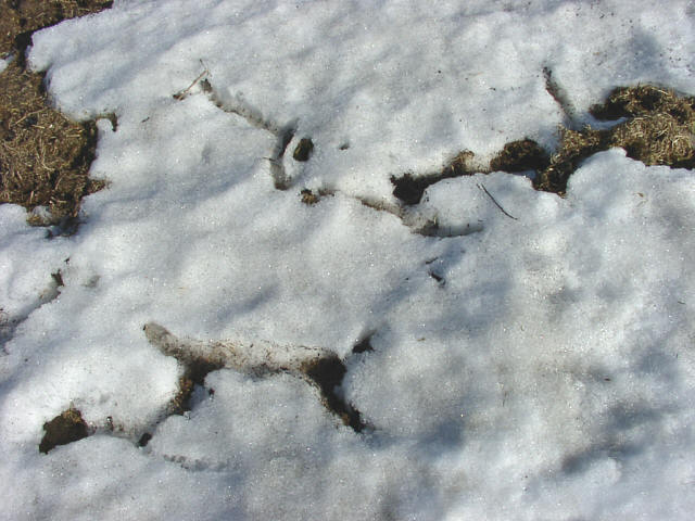 | エゾヤチネズミ 雪解けと共に雪の下のトンネル構造があきらかになってきました。 |