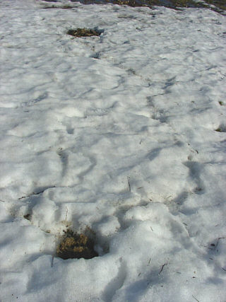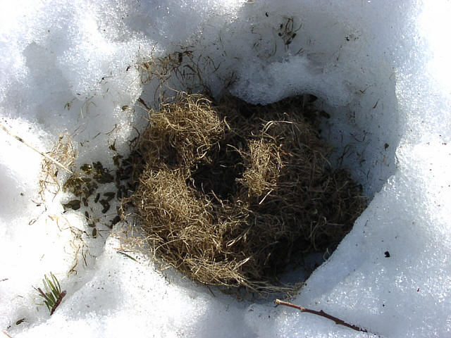 ![]() ![]() 雪解けが進むと下から秘密のトンネルと秘密基地が見えてきます。 ![]() 鳥の巣のような草を敷き詰めた丸い草のかたまりがあります ネズミの出す熱のためかまわりは溶けていて、雪が解けて天井が開くと、 ぽっかりと穴が開いたようになります。 ![]() トンネルがあちこちに走っています。 |