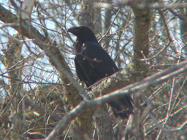 | このワタリガラスは、釣り糸が絡まったのか? 右目に障害を負っています。 このあたりの他のワタリガラスは見られなくなったので、このワタリガラスだけは渡れずに残っているのかもしれません。 それともシカの死体が多いこの地に留まって養生しているのでしょうか。他の場所ではまだワタリガラスが残っています。 薫別にて。 |