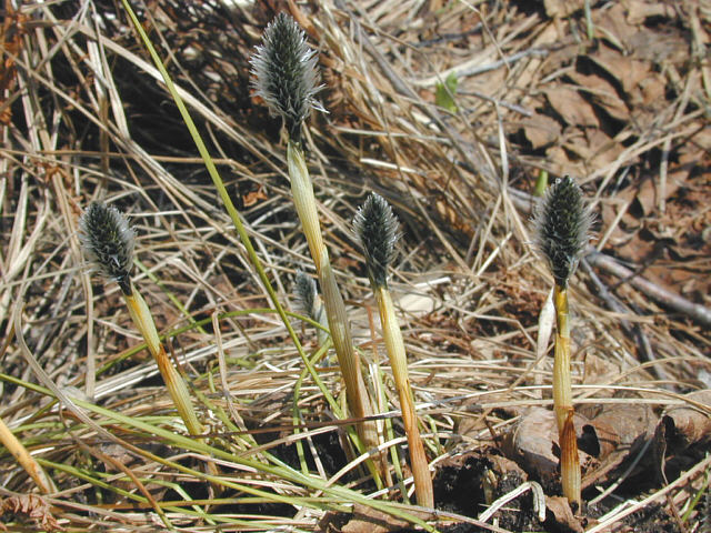![]() ワタスゲの花穂。 ![]() 灰色の鱗片は、さわると、かわいていてかさかさします。 ![]() 咲くと花粉で黄色くなります。 |