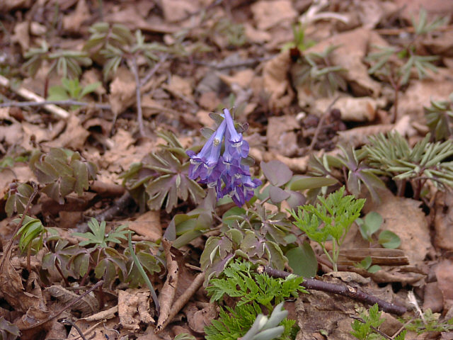 | エゾエンゴサクが開花しました。ケシ科。花の色は変化が多い。 食用にされ、また根茎を乾燥したものを鎮痛剤にもしたそうです。 ポー川史跡自然公園にて。 |