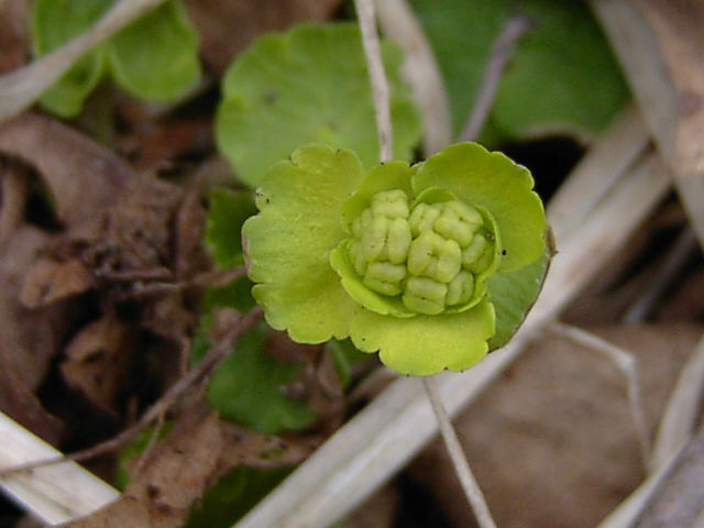 | エゾネコノメソウがつぼみをつけています。 ユキノシタ科。 花が開くと、周りの葉も黄色になり、目立つようになります。 ポー川史跡自然公園にて。 |