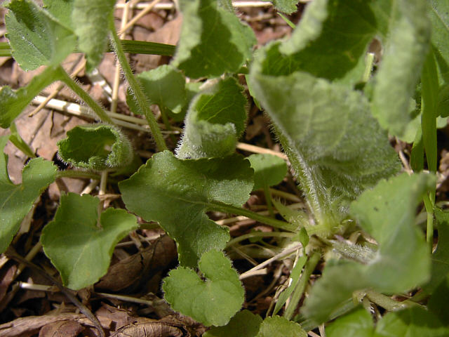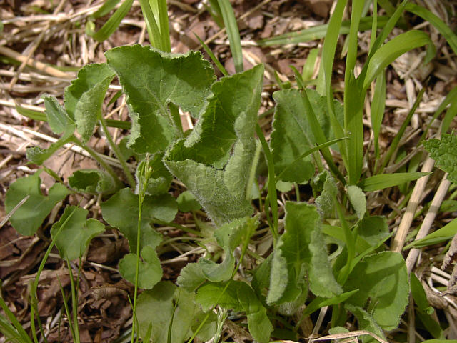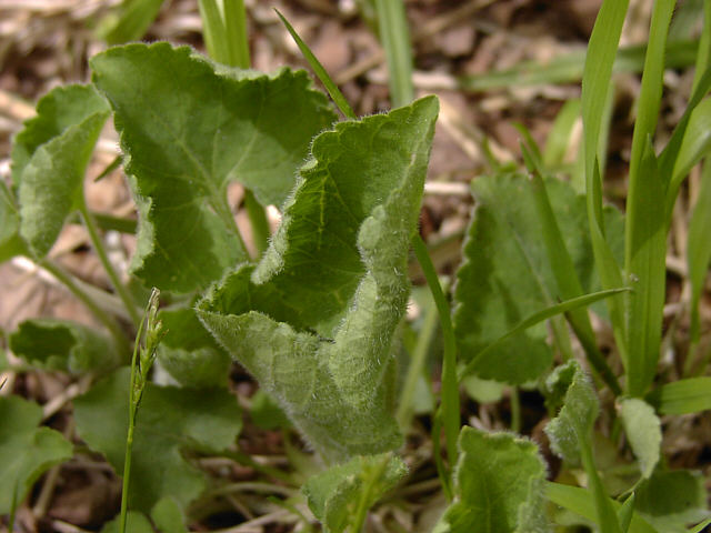 | 早春に花をさかせるスミレ、アオイスミレ。花は既におわり葉を広げています。大きく葉を広げるので、その葉をフキにみたてた「ヒナブキ」という別名もあります。 |