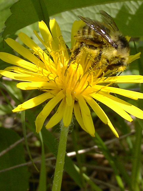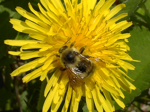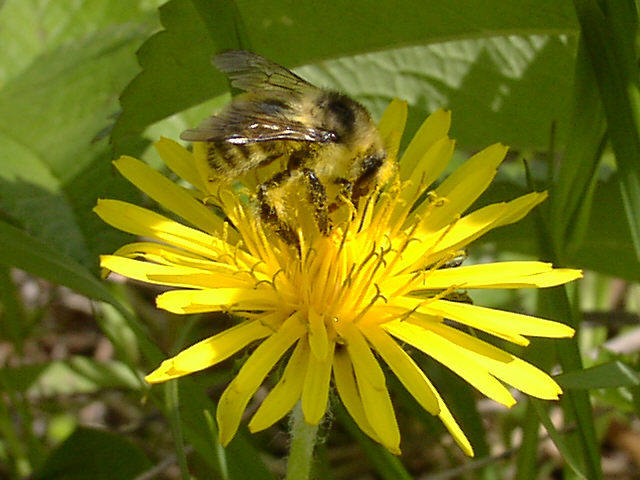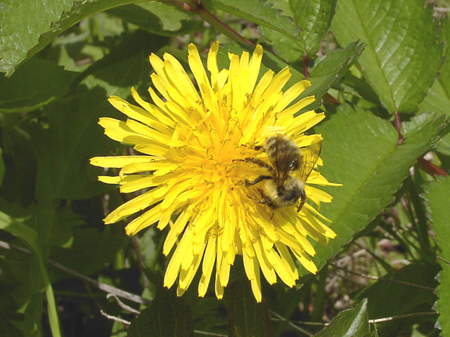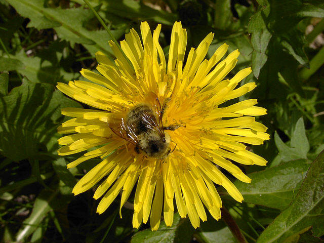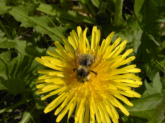 | シコタンタンポポの花にマルハナバチが訪れています。ハイイロマルハナバチかニセハイイロマルハナバチ の女王です。腹部の黒い3本帯が特徴。両種の野外での識別は難しいようです。 野付半島にて。 |